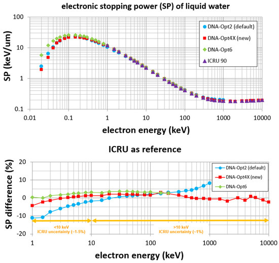Figure 6 (top panel) compares the electronic stopping power (hereafter SP) calculated by DNA-Opt2, which extends up to 1 MeV, the present model (DNA-Opt4X), which extends up to 10 MeV, and DNA-Opt6 which extends up to 256 keV. SP values from ICRU Report 90 (which is the most recent ICRU Report on the subject) are also depicted [59]. The simulated SP data have been obtained by the Geant4 example called spower [17], which transports the particle in frozen velocity mode. Importantly, in the present context, the SP results depend solely upon the ionization and excitation cross sections implemented into the code (i.e., they are not influenced by the elastic model contained in the corresponding constructors). The statistical uncertainty of the SP data presented is less than 1%. It should be noted that the simulated SP data by the different Geant4-DNA constructors (DNA-Opt2, DNA-Opt4X, DNA-Opt6) are essentially equivalent to the numerical calculation of SP through Equation (14) using the ionization DCS and excitation TCS of the corresponding constructor. In the bottom panel of Figure 6, the percentage difference in the simulated SP data of each constructor (i.e., inelastic model), from the ICRU values is presented, i.e., . The comparison is limited to the ICRU energy range from 1 keV to 10 MeV. Traditionally, ICRU does not provide SP values for electrons at sub-keV energies due to the limitations of the Bethe formula upon which they are based. Specifically, the Bethe SP formula neglects inner-shell corrections and effects beyond the first Born approximation (apart from a kinematic upper cutoff energy limit to knock-on electrons due to indistinguishability). These effects become gradually significant below a few keV. Therefore, the uncertainty of ICRU’s SP values is rapidly increasing below 10 keV. In our calculation scheme, inner-shell corrections are automatically included via the dispersion relations that extend ELF to non-zero q, while non-Born effects are included ad hoc through the Mott–Coulomb terms (in addition to the kinematic limit due to indistinguishability).