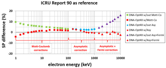 It can be seen that the present model (DNA-Opt4X), not only extends the application of Geant4-DNA to higher energies, namely up to 10 MeV (compared to the 1 MeV upper limit of DNA-Opt2 and 256 keV of DNA-Opt6), but also offers much better agreement with the SP values of ICRU Report 90 [59]. Specifically, in the energy range from 10 keV to 10 MeV, where the ICRU values are most reliable (with reported uncertainty at the ~1% level), the present model (DNA-Opt4X) deviates by up to ~3%. In the low energy range of 1–10 keV, the deviation of DNA-Opt4X from ICRU is between 1 and 5%, which roughly coincides with the reported uncertainty range of the ICRU values [59]. It is noteworthy that the deviation of DNA-Opt2 from ICRU is consistently higher than the present model, reaching up to 10% at both the low and high energy end. Similarly, the deviations of DNA-Opt6 from ICRU are also slightly higher than the present model. In Figure 7, we illustrate the influence of the various corrections implemented into the present model (DNA-Opt4X) (see Figure 1) in the calculation of the SP. Specifically, the percentage difference between the present SP data, calculated with and without the individual corrections, and the ICRU values (which are used for benchmarking), is presented over the energy regime where these corrections are applied, i.e., in accordance with Figure 1, we have split the comparison into the energy regions 1–100 keV (Regime II), 100 keV–1 MeV (Regime III), and 1–10 MeV (Regime IV). Note that the comparison is limited to the energy range from 1 keV to 10 MeV where SP data are provided by ICRU. Evidently, the deviations of the present model from ICRU decrease from ~10–15% (without corrections) to ~3% (with corrections).