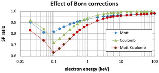 In Figure 8, we focus on the influence of the low-energy corrections (i.e., the Mott and the Coulomb corrections) on the SP over the energy range where these corrections are applied, i.e., from 10 eV to 100 keV (see Figure 1). Specifically, we depict the ratio of the SP with the corrections to the SP without the corrections, i.e., . Both the individual and combined effects of the Mott and Coulomb corrections are shown. As expected, the ratio is less than unity at all energies depicted. Specifically, it can be seen that the combined effect of the Mott and Coulomb corrections reduces the SP by up to ~40% at 100 eV and gradually vanishes at 100 keV where the ratio approaches unity (≥0.99), i.e., the effect on SP falls below the 1% level. Therefore, low-energy corrections are included in DNA-Opt4X only in the energy Regimes I and II (see Figure 1).