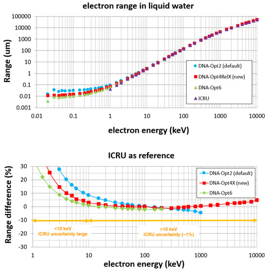 Another magnitude which depends solely upon the inelastic model (i.e., on the ionization and excitation cross sections) is the pathlength (see Equation (15)). Geant4 offers a ready-to-use example called range [17], which calculates (among other things) the average pathlength (or range) of the particle in a medium until its energy falls below a pre-determined cutoff value set by the user (called “tracking cut” in Geant4). Figure 9 presents simulation data of the electron range as a function of the (initial) electron energy with tracking cut set at 10 eV (i.e., Tfinal = 10 eV in Equation (15)) for DNA-Opt2, which extends up to 1 MeV [15,17], the present model (DNA-Opt4X), which extends up to 10 MeV, and DNA-Opt6, which extends up to 256 keV [17,45]. The statistical uncertainty of the data depicted is less than 1%. Range values from ICRU Report 90 are also depicted for comparison [59]. The ICRU values are determined based on the continuous slowing down approximation (CSDA) whereby the range is defined as an integral over the reciprocal SP (see Equation (15)). In the bottom panel of Figure 9, the percentage difference in the simulated range data of each constructor from the ICRU values is presented, i.e., . The comparison is limited to electron energies from 1 keV to 10 MeV where ICRU values are available. Note that the uncertainty of the range values given by ICRU increases rapidly below 10 keV. This is due to the limited accuracy of the Bethe SP formula (entering Equation (15)) for energies 1–10 keV (already discussed above) and, most importantly, to the crude (linear) extrapolation of SP from 1 keV down to 0 eV adopted by ICRU in the CSDA calculation via Equation (15). Thus, ICRU’s range value below 10 keV should be considered only as qualitative.
