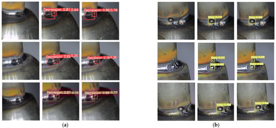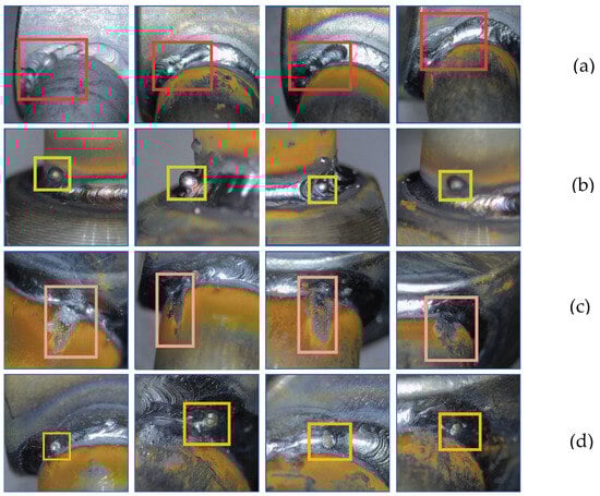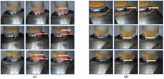 Figure 13 presents a test set sample containing four types of welding defects: pits, slag, scratches, and bubbles. For pits and slag, the original algorithm demonstrates satisfactory detection performance, with the improved algorithm yielding a slight increase in mAP@50. However, the original algorithm exhibits suboptimal detection performance for scratches and bubbles. As observed in Figure 13c, the original algorithm suffers from the missed detection of scratches. The improved algorithm addresses this issue, significantly enhancing detection accuracy. Furthermore, the improved algorithm also shows a notable improvement in bubble detection accuracy, with mAP@50 increasing by approximately 10%, representing a substantial advancement.