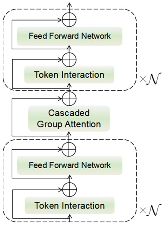 The sandwich layout is shown in Figure 5; input features pass through Feed-Forward Networks (FFNs), followed by cascaded group attention, and are then processed by additional FFN layers to produce the output features. This design aims to improve the model’s memory efficiency while enhancing computational and parameter efficiency. The calculation formula is as follows: