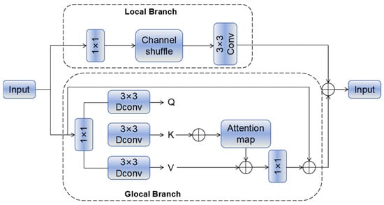 In the global branch, as is shown in Figure 6, an attention mechanism is introduced to enhance long-range information interaction. Initially, convolutions and depthwise convolutions generate the (Query), (Key), and (Value) tensors. These tensors, with specific dimensions, are reshaped to compute the attention map, focusing on relationships between image regions. Some formulas for the global branch are as follows: