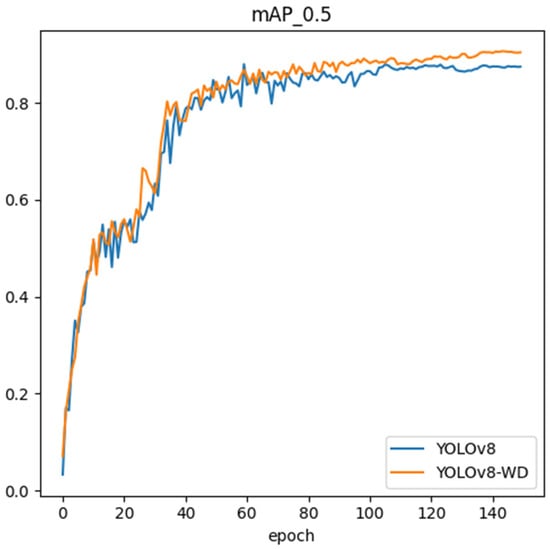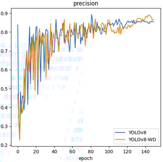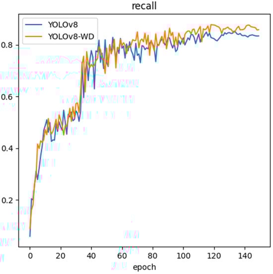 As illustrated in Figure 8, YOLOv8-WD initially exhibits lower accuracy compared to YOLOv8 but surpasses it in later stages of training. However, the accuracy curve for YOLOv8-WD does not stabilize smoothly towards the end, indicating that while the model’s performance improves over time, it does not achieve a steady increase in accuracy. Figure 9 demonstrates that YOLOv8-WD’s recall rate consistently surpasses that of YOLOv8, reflecting a superior ability to capture positive samples. According to Figure 10 and Table 2, YOLOv8-WD shows a 3% improvement in mAP@50 over YOLOv8 and exhibits a stable convergence of the curve. This stability indicates that YOLOv8-WD possesses robust performance, good generalization capabilities, and an effective training strategy. Consequently, YOLOv8-WD proves to be more valuable in object detection tasks, particularly in scenarios requiring high reliability and consistency.