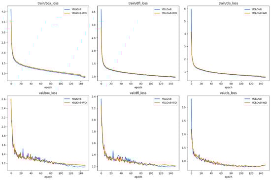 Figure 11 shows that YOLOv8-WD’s box, dfl, and classification loss curves are similar to YOLOv8 on the training set, indicating comparable learning and stability. On the validation set, YOLOv8-WD exhibits smoother Box and DFL loss curves, suggesting greater robustness. However, its slightly higher loss values indicate that the added complexity in YOLOv8-WD results in increased loss due to more features being processed. This does not necessarily reflect worse performance, and additional metrics are needed for a full assessment.
