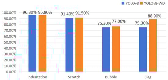 Figure 12 compares the defect detection results between YOLOv8 and YOLOv8-WD by defect category. YOLOv8 performed well on dents and scratches with mAP@50 scores of 96.30% and 91.40%, respectively, but less effectively on bubbles and slag, with scores of 75.30% each. YOLOv8-WD showed similar performance on indentations and scratches but improved detection of bubbles and slag, with mAP@50 increasing by 1.7% and 13.6%, respectively. Thus, YOLOv8-WD effectively mitigates dataset class imbalance, reducing average precision gaps and achieving more balanced performance.