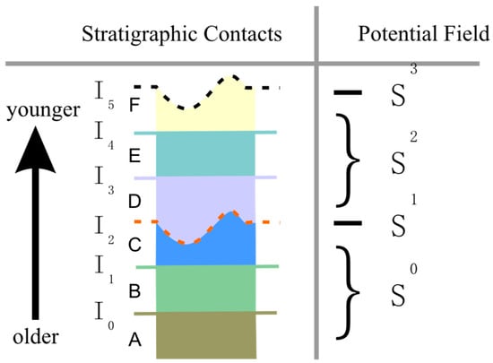 In 3D geological modeling, the spatial distribution of strata is commonly represented by using the potential field method, which involves defining potential fields. The appropriate number of potential fields is determined based on the stratigraphic contact relationships, ensuring that the morphological characteristics of each stratigraphic surface are accurately captured. The stratigraphic contact relationship is determined through geological field observations, combined with the stratigraphic age relationship, and represented on the stratigraphic column. If two strata are in contact, share the same depositional environment, and exhibit integrated properties, they are represented by the same potential field due to their similar stratigraphic characteristics. Conversely, if there is an unconformity or significant depositional difference between the strata, each unconformity is assigned its own potential field to ensure that the geological features are accurately reflected in the model, as shown in Figure 1. In Figure 1, six stratigraphic surfaces are shown, including two unconformable interfaces ( and ) and four conformable interfaces (, , , and ). These are modeled by constructing four potential fields based on the stratigraphic contact relationships. The stratigraphic surfaces and units correspond to potential fields as follows: potential field is associated with stratigraphic surfaces , , and units , , and ; potential field is associated with stratigraphic surface ; potential field is associated with stratigraphic surfaces , , and units , , and ; and potential field is associated with stratigraphic surface .