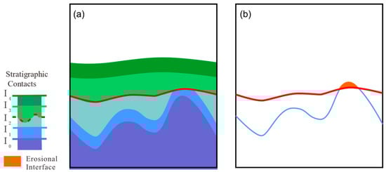 Schematic illustration of the potential field for the erosion section: (a) original stratigraphy; (b) stratigraphic surfaces and corresponding to the extracted potential fields and erosion section.