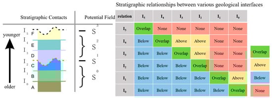 Layer ordering relationships between stratigraphic surfaces based on potential field value sequence, illustrating the “above”, “below”, and “overlap” relationships in the stratigraphic model.