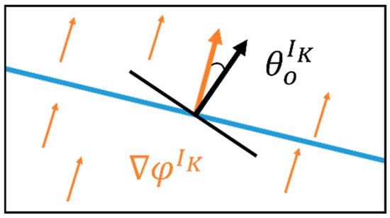 The spatial geometric features of strata, including structural orientation, dip, and dip direction, are described by the attitude. For the potential field related to the stratigraphic surface , attitude points are defined on the surface, with each point belonging to . At this point , the angle between the actual attitude direction vector and the potential field gradient is used to indicate the angular constraint for the attitude point, as illustrated in Figure 4. In this figure, the trend of the potential field surface is shown by the blue line, the gradient of the potential field at point is represented by the orange arrow, and the actual attitude direction vector at point is denoted by the black cross-arrow. The difference between the actual attitude direction vector and the potential field gradient is measured by the angle . When the attitude direction vector and the potential field gradient at point are closely aligned (i.e., angle approaches 0°), a strong attitude constraint in the constructed potential field at point is signified.
