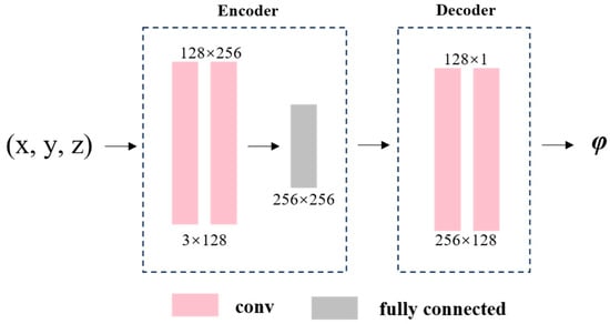 A network model for predicting the 3D potential field is presented in this work, built from stacked autoencoders with an encoder–decoder structure. Each autoencoder consists of an encoder–decoder structure, as shown in Figure 5, where the encoder is composed of two convolutional layers with kernel sizes of 3 × 128 and 128 × 256, followed by a fully connected layer of 256 × 256. The decoder is composed of two convolutional layers with kernel sizes of 256 × 128 and 128 × 1. The convolutional layers are used with a kernel size of 1 and a stride of 1, ensuring that the input tensor’s dimensions are preserved while producing output tensors with the same height and width but varying channel depth.