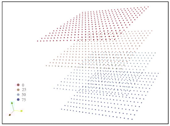 The process of initializing parameters, such as weight matrices, using geometric properties is referred to as geometric initialization of network variables. In this study, the model was designed to represent stratigraphic surfaces, so the output potential field generated by the initialized network variables was required to reflect a reasonable initial geometry for these surfaces. This requirement was addressed by pre-training the network with the provided data. Various geometric initialization methods, including orthogonal, unit circle, and spherical initializations, were used. For stratigraphic modeling, planar initialization was applied during the pre-training process, while spherical initialization was applied for intrusion-like structures. Therefore, this work focuses primarily on planar initialization methods for stratigraphic surfaces. The planar geometry used for pre-training is shown in Figure 7.