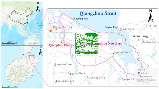 Borehole distribution and modeling scope of Jiangdong new district, Haikou City.
