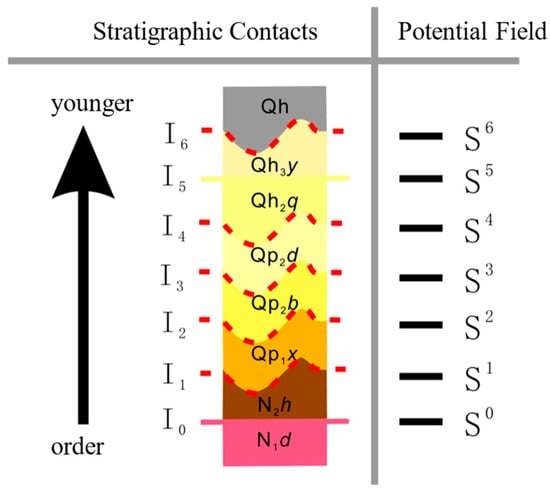 Here, the total number of stratigraphic surfaces is represented by , and a specific potential field is denoted by .