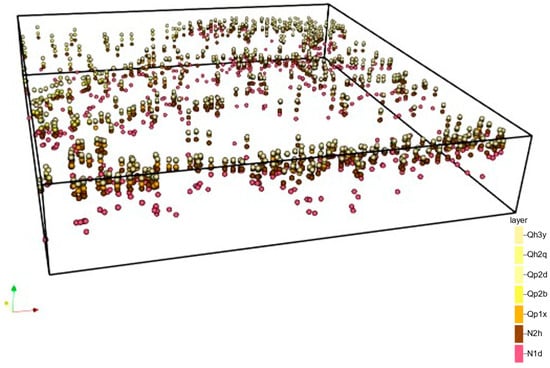 The data from 517 boreholes were discretized to obtain stratigraphic surface sampling points. Each sampling point consists of the x and y coordinates of each borehole, the top surface of each stratigraphic layer, and the corresponding stratigraphic surface code. After discretization, a total of 3619 stratigraphic surface sampling points were generated for model training. The distribution of these points is detailed in Figure 11.