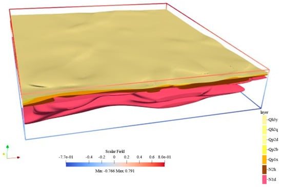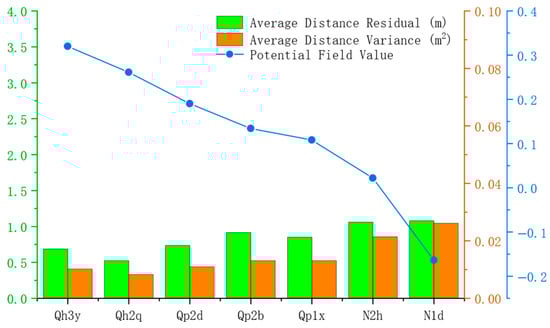 The average distance residuals and variances (in real-world distances) for each stratum were calculated using the model generated by PyVista, as shown in Figure 16. The potential field values decrease progressively from younger to older strata, in accordance with the stratigraphic sequence constraints proposed in this study. For most strata, the average distance residuals are below 1 m, except for strata N2h and N1d, where the values approach 1 m. This indicates that the model exhibits high spatial prediction accuracy, with the predicted stratigraphic surfaces closely matching the distribution of stratigraphic surface sampling points. However, the higher variance in the mean distances for strata N2h and N1d reflects greater internal variability and geological complexity in the actual data, suggesting that the model does not fully capture the unique characteristics of these strata.