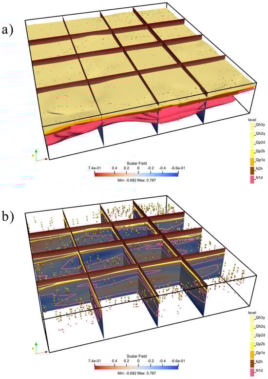 The 3D potential field is shown in Figure 12, with isosurface extraction performed using the PyVista open-source library [40]. The resulting 3D stratigraphic surface model is displayed in Figure 13. The model’s spatial resolution is 50 m in the x and y directions and 10 m in the z direction, enabling detailed capture of stratigraphic variations and ensuring the model accurately represents the geological structure. Figure 14 presents a 3 × 3 section of the model, illustrating the fit of the data within the model.