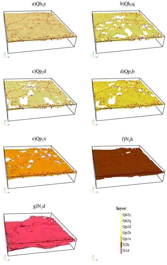 The fit between each modeled stratigraphic surface and its corresponding sampling points is shown in Figure 15, with panels a to g representing seven strata, ordered from youngest to oldest. The modeled surfaces and the sampling points generally align well, with most points overlapping the surfaces. However, a few points lie outside the surfaces due to significant stratigraphic undulations, which make full constraint difficult. The core method for constructing geological models using the PyVista library involves extracting a series of consecutive isosurfaces from the potential field and processing them iteratively, from oldest to youngest. When processing an older stratigraphic surface, the algorithm identifies any younger unconformity surfaces above it that intersect with the current surface. This approach ensures the creation of a layered model that more accurately represents the geological structure. For instance, the voids observed in the Qh2q and Qp2d stratigraphic surfaces in Figure 15 reflect this phenomenon, indicating sedimentary discontinuities or erosional events in geological history. The N1d stratigraphic surface in Figure 13 displays significant vertical folding, which may be attributed to two factors: complex tectonic movements that caused substantial vertical height changes and folding, and the intricate nature of the vertical sampling data for the N1d surface, which may challenge the interpolation algorithm in capturing fine variations, leading to unnatural folds in the stratigraphic layers. Overall, the fitting results and structural features shown in Figure 15 provide important insights for geological modeling, revealing the relationships between strata and their historical evolution, thereby enhancing the understanding of complex geological processes.