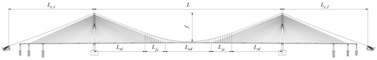 Figure 1 shows the elevation of the hybrid bridge system, including the cable-stayed section (), the pure suspension section (), and the hybrid cable-stayed suspension section (). The following assumptions are made in the proposed model.