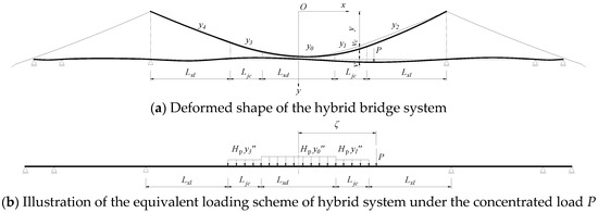 Due to different loading systems in different sections of the hybrid bridge, the differential equilibrium equations are derived in the hybrid, suspension, and cable-stayed sections, respectively.