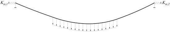 Based on the assumption that the hangers have negligible elongation, , and [31], then, the Equation (4) can be simplified as follows: