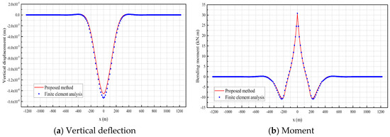 Considering a unit load of 1 kN applied in the middle-span, the deflection and moment of the elastic main beam are computed using both the numerical model and the proposed model. Comparisons of the deflection curve and moment are shown in Figure 8a and 8b, respectively. As seen in Figure 8a, the deflection curve computed using the proposed model matches well with that by the numerical model. The maximum deflection of the main beam at the middle-span is and based on the numerical model and the proposed model, respectively, and the difference is −5%, which is small. Similarly, as seen in Figure 8b, the moment computed using the proposed model also matches well with that using the numerical model. The maximum moment of the main beam at the middle-span is and based on the numerical model and the proposed model, respectively, and the difference is −0.4%, which is also small. Therefore, when a concentrated unit load is applied at the middle span, the proposed method can give an accurate estimation of the deflection and moment of the main beam.