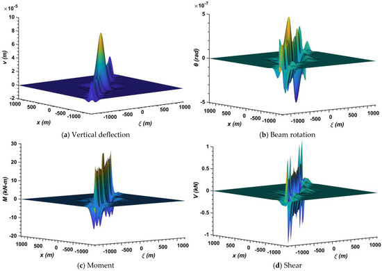 When a unit load 1 kN is applied at an arbitrary location , the corresponding vertical deflection, rotation, moment, and shear of the main beam at a point is computed using the proposed model. Then, the influence lines of vertical deflection, rotation, moment, and shear of the main beam at all are computed and the results are shown in Figure 9a, 9b, 9c, and 9d, respectively.