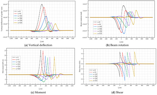 It is seen in Figure 9c that the beam moment influence lines are all approximately symmetric about , and its distribution range is larger than that of the vertical deflection. When the unit load is applied at , the maximum value of the beam rotation influence line is which occurs at the concerned location .