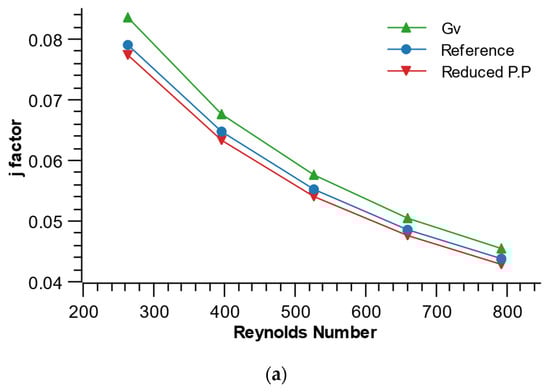 The values of the j-factor according to velocity for the optimized shapes based on the objective functions are presented in Figure 10a. It is evident that the Gv shape has the highest j-factor at the same velocity. Compared to the reference shape, the j-factor of the Gv shape improved by an average of about 4.48%. It is about 5% higher than the reference shape at low velocities, but the performance improvement tends to decrease as the velocity increases. The reduced-pumping-power shape showed a decrease in the j-factor compared to the reference shape, with an average reduction of about 2.1%.