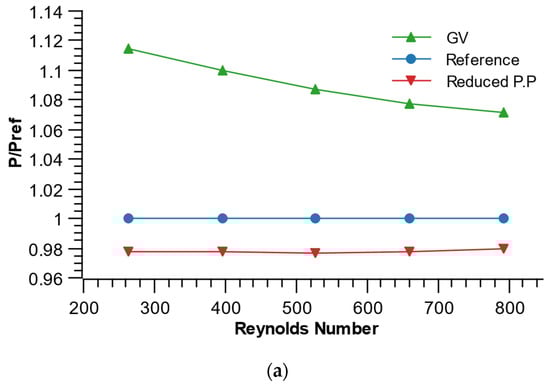 Figure 11a compares the pumping power for the three shapes. For the shape optimized for P, compared to the reference shape, the reduction trend remained constant within a range of 2% regardless of changes in the Reynolds number. However, for the Gv shape, as the airspeed decreased and the Reynolds number decreased, P increased by 7–11% compared to the reference shape. This was attributed to the definition of Gv: It is proportional to 1/3rd of the f-factor compared to the j-factor.