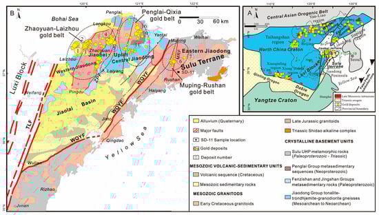 (A) Tectonic sketch map of eastern continent of East China, showing the location of the Jiaodong Peninsula. Adapted with permission from Ref. [3], 2012, Elsevier. (B) A simplified geological map of the Jiaodong Peninsula showing the distribution of basement rocks, Mesozoic Igneous rocks, main faults and representative gold deposits. Adapted with permission from Ref. [1], 2015, Elsevier. The location for sample SD-11 is from Ref. [15]. Abbreviations: WQYF, Wulian–Qingdao–Yantai Fault; TLF, Tan–Lu Fault; ZPF, Zhaoping Fault; MRF, Muping–Rushan Fault. Typical gold deposits: ① Sanshandao; ② Jiaojia; ③ Wang’ershan; ④ Linglong; ⑤ Taishang; ⑥ Rushan; ⑦ Xiawolong; ⑧ Xiadian; ⑨ Zhuangzi; ⑩ Daliuhang; ⑪ Hushan.