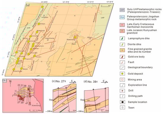 Geological sketch maps of the Muping–Rushan gold belt (a) and the Xiawolong gold deposit (b). Adapted with permission from Ref. [20], 2022, Elsevier. Geological profile maps of prospecting line 27# (c) and 39# (d) of the Xiawolong gold deposit, showing sample locations analyzed in this paper. Note: the yellow-shaded curved surface indicated by the black curve shows the topography relief in Figure 2a.