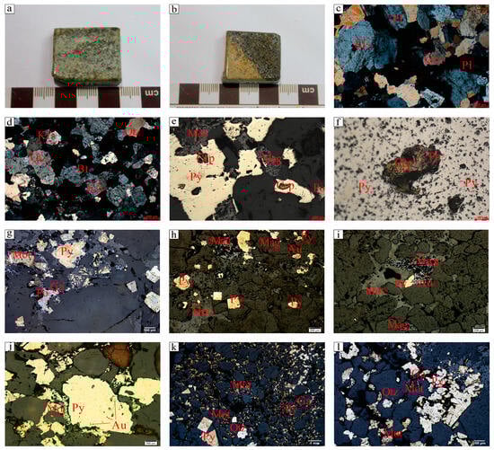 (a,b) Photograph of representative disseminated and stockwork-style ore samples for molybdenite Re–Os dating, respectively. (c,d) Photomicrographs under transmitted light, showing the gangue minerals of K-feldspar, plagioclase, quartz and biotite. (e–g) Photomicrographs under reflected light, showing the ore minerals of pyrite, pyrrhotite, magnetite, chalcopyrite, molybdenite and galena. (h–j) Photomicrographs under reflected light, showing the medium-fine-grained native gold coexisting with pyrite, magnetite and molybdenite. (k,l) Photomicrographs under reflected light, showing molybdenite intergrown with pyrite and galena along the grain margin of quartz. Abbreviations: Qz, quartz; Bt, biotite; Kfs, K-feldspar; Pl, plagioclase; Py, pyrite; Mot, molybdenite; Mag, magnetite; Po, pyrrhotine; Ccp, chalcopyrite; Ga, galena; Au, gold.