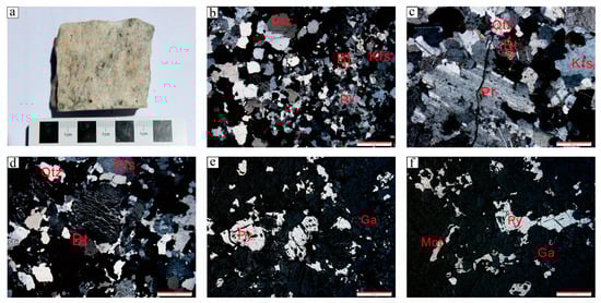 In addition, two typical samples of the fine-grained granite for LA-ICP-MS zircon U–Pb dating are collected from drilled cores, with the locations shown in Figure 2c,d. Samples XWL4ZK1B2 and XWL5ZK4B3 are monzogranites, which have a fine-grained subhedral equigranular granitic texture with a grain size of 0.4–0.8 mm and are gray-white in appearance (Figure 4a). The main minerals are dominated by quartz (35–39%), K-feldspar (20–26%), plagioclase (18–23%) and biotite (2–5%) with few accessory minerals of zircon (Figure 4b–d), as well as a few metallic minerals (e.g., pyrite, galena and molybdenite) (10–15%) (Figure 4e,f). No deformation or hydrothermal alteration are observed (Figure 4).