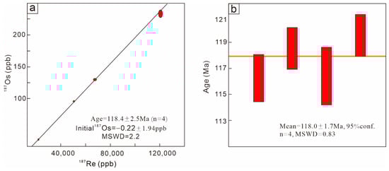The abundances and isotopic compositions of Re–Os for four molybdenite samples of the Xiawolong gold deposit are shown in Table 1 and illustrated in Figure 5. The Re and 187Os abundances in these samples are 33.85–192.6 ppm and 41.3–234.72 ppb, respectively, which are much higher than the Re and 187O blanks of 4 pg and 0.09 pg, respectively, in this test, and the 187Re concentrations are 21.28–121.1 ppm. However, the common Os is also detectable in these molybdenite samples; three samples of which have low common Os contents of 0.0043–0.7217, with 187Os/common Os ratios of 288.61–23,239.53 much higher than 20, suggesting that common Os have little effect on calculating the model Re–Os age [61]. Although the sample of XWL-g4 contains a relatively higher common Os of 8.1377 ppb with a 187Os/common Os ratio of 16.38, a little lower than 20, the calculated model age of 118.57 ± 1.62 Ma is consistent with those of the other three samples, which range between 116.26 ± 1.84 Ma and 119.59 ± 1.62 Ma, within uncertainty. All the four model Re–Os ages give a weighted average age of 118 ± 1.7 Ma (MSWD = 0.83, 2σ) (Figure 5a). Furthermore, the regression for the 187Re and 187Os data of all the four molybdenite samples yields a well-constrained isochron age of 118.4 ± 2.5 Ma (MSWD = 2.2, 2σ), with a bigger error initial 187Os abundance of 0.22 ± 1.94 ppb (Figure 5b), which is consistent with the weighted average Re–Os model age within errors. Based on the identical single Re–Os model age, the weighted mean model age and the isochron age within uncertainties, it is suggested that the molybdenite Re–Os analytical results are accurate.