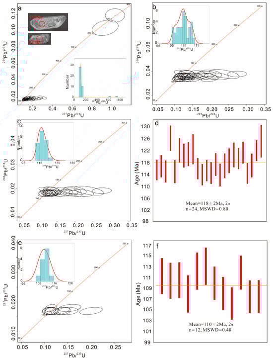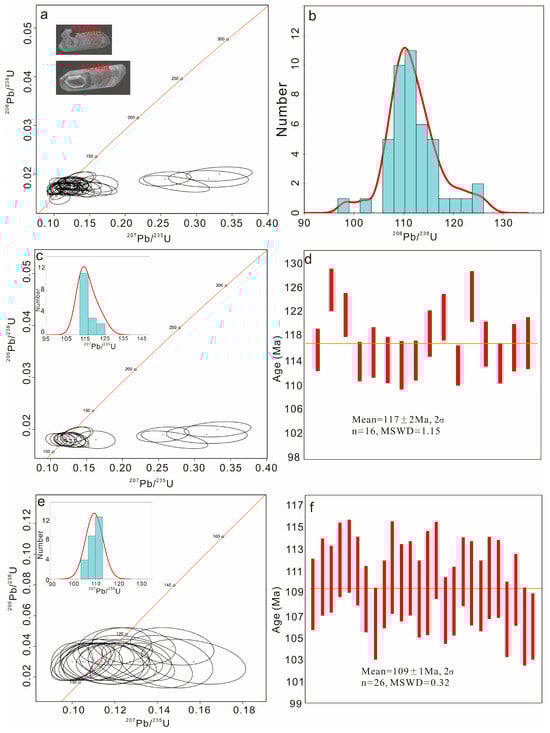 For sample XWL5ZK4B3, forty-four zircon spots produce 206Pb/238U ages of 98 ± 3–126 ± 4 Ma (Table 2; Figure 7a), except for two younger grains that show 206Pb/238U ages of 98 ± 3 Ma and 102 ± 3 Ma, likely resulting from a later thermal disturbance. The other grains also form two populations (Figure 7a,b), similar to those of sample XWL4ZK1B2 (Figure 6b). One population has 16 grains and gives 206Pb/238U ages of 113 ± 3 Ma and 126 ± 4 Ma, with a weighted average age of 117 ± 2 Ma (2σ, MSWD = 1.15) (Figure 7c,d), and the other has 26 grains and shows 206Pb/238U ages of 106 ± 3 Ma to 112 ± 3 Ma, with a weighted average age of 109 ± 1 Ma (2σ, MSWD = 0.32) (Figure 7e,f).