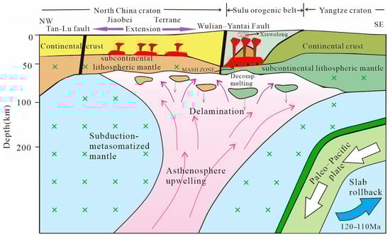 - Liu, J.; Ji, M.; Ni, J.; Shen, L.; Zheng, Y.; Chen, X.; Craddock, J.P. Inhomogeneous thinning of a cratonic lithospheric keel by tectonic extension: The Early Cretaceous Jiaodong Peninsula–Liaodong Peninsula extensional provinces, eastern North China craton. Geol. Soc. Am. Bull. 2021, 133, 159–176. [Google Scholar] [CrossRef]