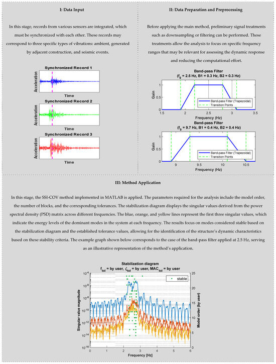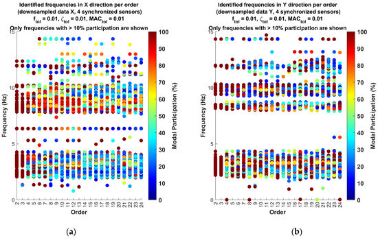 In this work, the SSI-COV method was applied following a series of detailed steps. Initially, and as a first exploratory step, the method was applied directly to the original raw data that were sampled at 400 Hz. The output is presented in Section 5 and it shows values in frequencies up to 70 Hz, but no noticeable frequencies of interest show up.