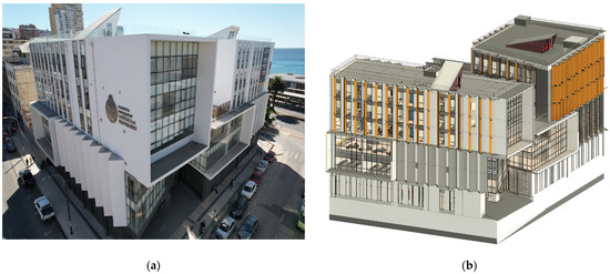 Figure 2 illustrates the building under study. On the left (a), a photograph of the building is shown, while on the right (b), the digital model developed in Revit is presented.