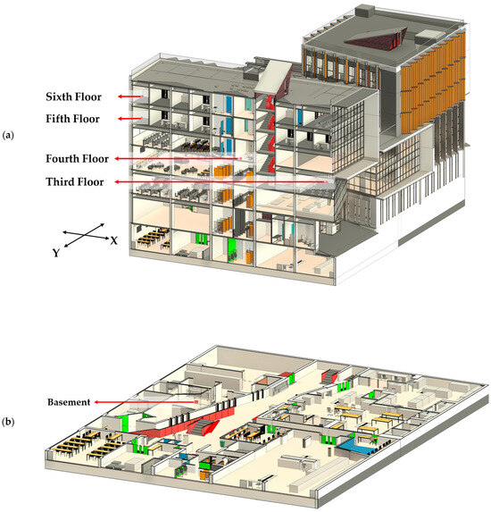 Sensor distribution in the building: (a) upper floors (3rd to 6th levels), and (b) basement.