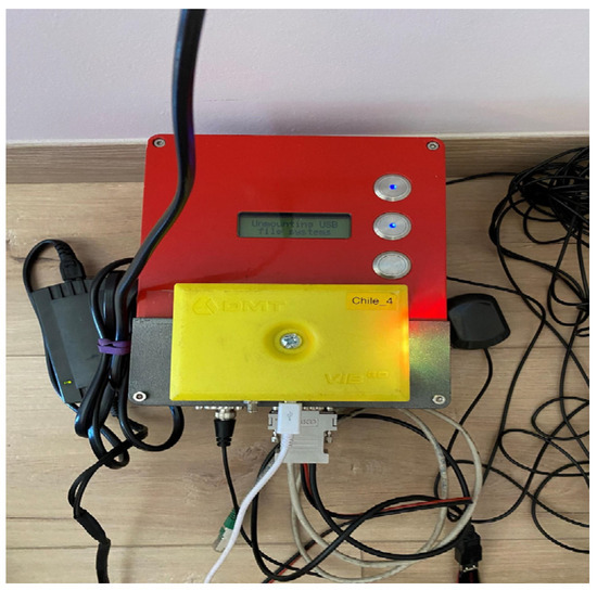 For vibration recording, triaxial force-balance accelerometers from the SARA brand, model SL06 ACEBOX, were used. These devices integrate three sensors corresponding to the X, Y, and Z directions, allowing the dynamic response to be captured in the building’s three orthogonal axes. Figure 4 shows an accelerometer installed in the building. Table 2 summarizes the main characteristics of these accelerometers.