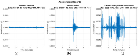 The monitoring campaign was developed with the objective of capturing the building’s dynamic responses under various loading conditions, including ambient, seismic, and construction-induced vibrations from an adjacent structure [15]. Accelerometers were installed on levels −1 (basement), 3, 4, 5, and 6 of the building, allowing for comprehensive coverage from the basement to the upper floors. To adapt to the operational conditions and optimize data capture, datasets were generated with configurations of two, three, and four synchronized accelerometers. Figure 5 shows acceleration records for ambient vibration, a seismic event, and vibrations from adjacent construction.