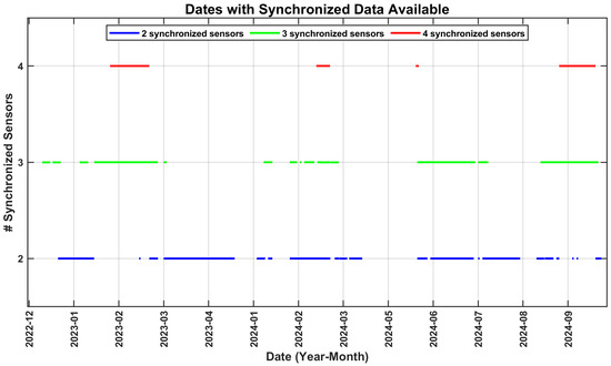 The color coding in the figure distinguishes the number of synchronized sensors, with blue lines representing configurations with two synchronized sensors, green lines indicating configurations with three synchronized sensors, and red lines denoting configurations with four synchronized sensors. The continuity of each line indicates the days with complete synchronization, while the gaps reflect periods without recorded data.