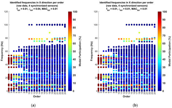 To evaluate the stability of the modes, two scenarios with different tolerance settings were analyzed. In the first scenario, a tolerance of 0.02 was used for the frequency, 0.05 for damping, and 0.02 for the MAC, while in the second scenario, a stricter tolerance of 0.01 was adopted for all parameters, allowing for greater precision in the identification and confirmation of the system’s dynamic modes.