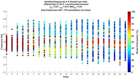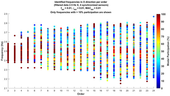 Identified frequencies in the X direction per order for data filtered at 2.5 Hz for 2024 ambient vibration (only frequencies with >10% participation are shown).