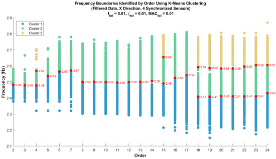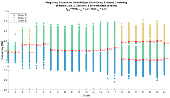 Continuing with the analysis, the clustering process is applied to the data to identify frequency boundaries. In Figure 13, it can be observed how the frequencies are grouped into different categories. Consistent with the previously analyzed data, red points represent the frequency boundaries identified for each model order, enabling the observation of dominant frequency ranges and their variations as the model order increases.