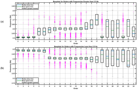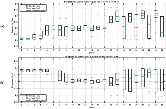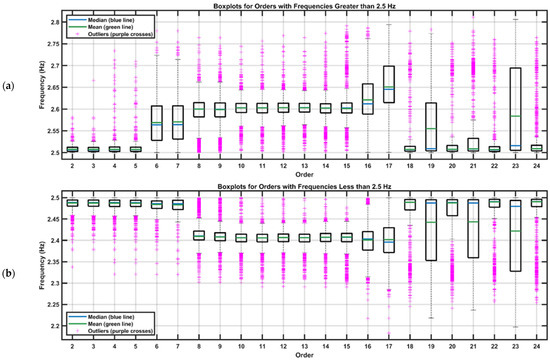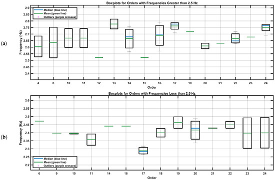 To analyze the concentration of data by order, boxplots were constructed while maintaining the 2.5 Hz threshold. Figure 14 presents these charts, allowing a visualization of the dispersion and variability of frequencies in each order, with frequencies above 2.5 Hz shown at the top and frequencies below 2.5 Hz at the bottom.