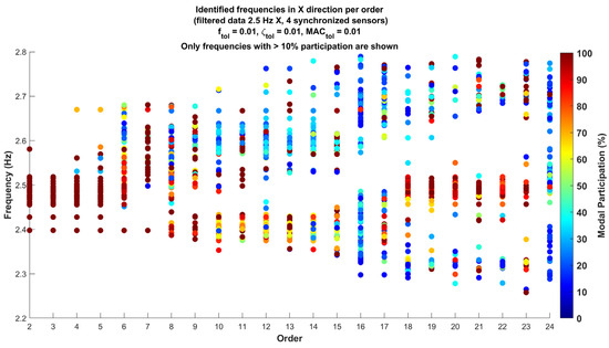 Identified frequencies in the X direction per order for data filtered at 2.5 Hz for adjacent construction vibrations (only frequencies with >10% participation are shown).