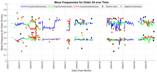 To analyze the time-dependent behavior of the system’s dynamic response, Figure 19 presents a specific study of the frequencies of order 24, filtered in relation to 2.5 Hz, both below and above this threshold. For this visualization, all frequencies of this order were extracted in 10 min intervals, maintaining the previous analyses of the range below 2.5 Hz and adding an additional analysis of the higher range. In each analysis, the frequency with the highest participation within each interval was selected. Then, the daily mean of these maximum frequencies was calculated to observe its evolution over time.