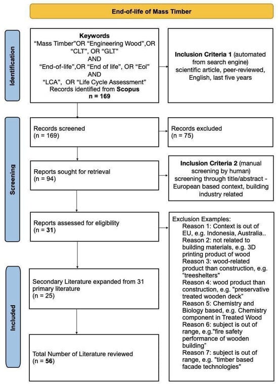 The 169 articles on EoL of mass timber were then screened in detail for the literature review. The literature review follows the PRISMA guideline [24] to ensure a transparent and systematic approach to examining the current literature on the EoL of mass timber with the full process shown in Figure 2.